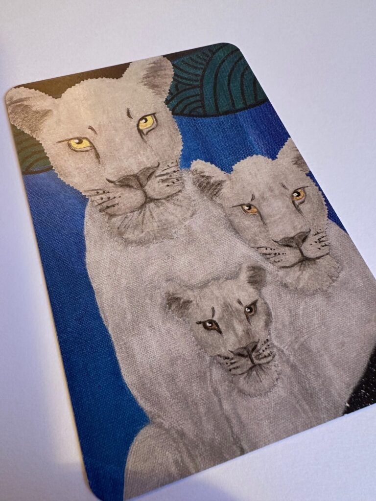 ps… Yep! The white lionesses will play the 2-handed journal strategy with you! (Write an inquiry with your dominant hand. When you sense a response, write it with your non-dominant hand. Really!) More info, and a way to get your very own set of Wisdom cards HERE!