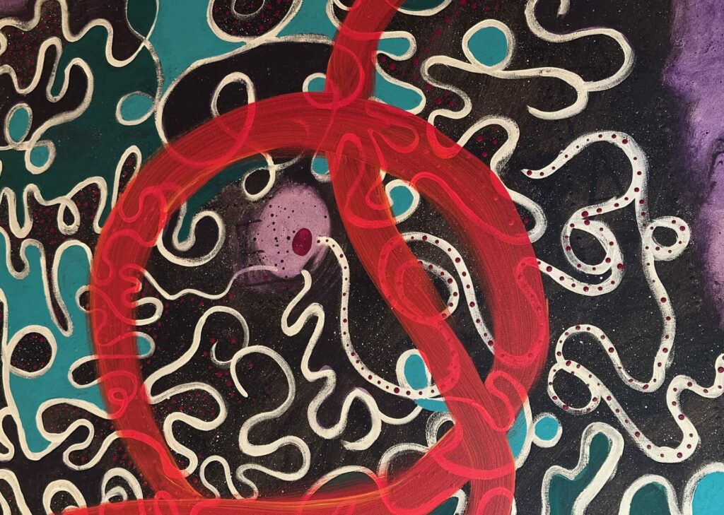 That’s it! The thing that looks rather like a purple eyeball. Technically, it’s my I Am Here! mark and it’s located next to an upper case “E” which is the last letter of the word Courage, deep in the under-layers of paint. The red “pupil” is my thumb print. An ancient sign for I Am Here!