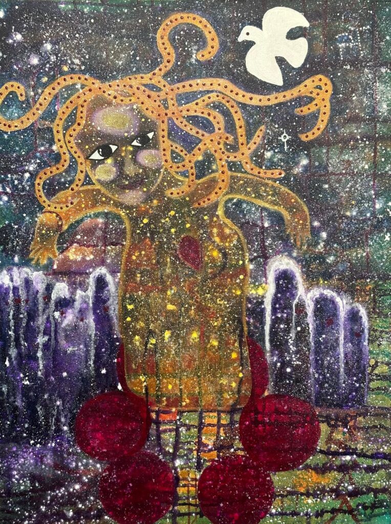 My night sky was intense. It had clusters of stars. Shooting stars. Nebulas. Deep Prussian blue with a fair share of teal. I put a shape of a woman on there and she said CLOUD. Ok… so I put a cloud on the canvas. A crack appeared corner to corner. That’s where the filters let the wisdom through!