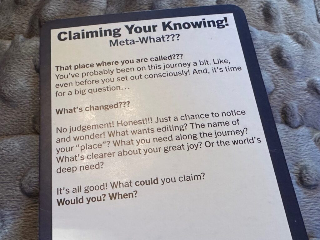Answer: Pull a card… from the Meta-What??? category, of course! They’re the ones that have that Tardis painting on the fronts. The Legendary Husband’s fav!!! Also, they’re the “what next” bunch. Feel free to journey along and ponder the questions!